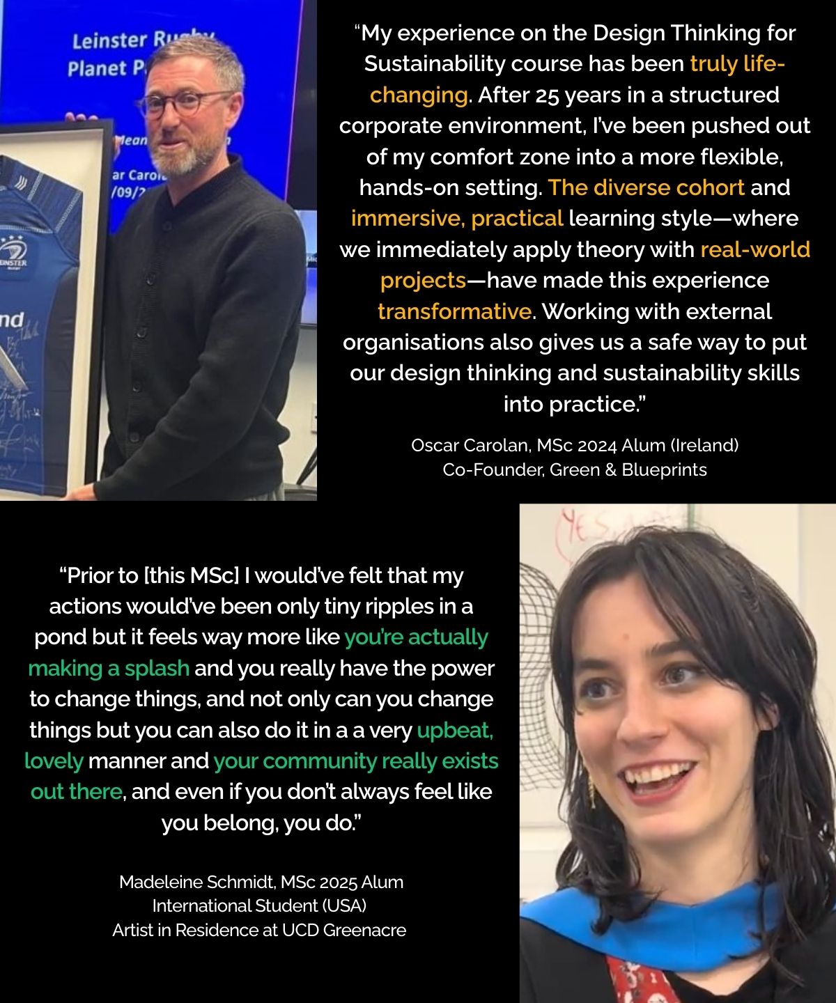 The UCD MSc in Design Thinking for Sustainability is a unique masters programme that bridges sustainability knowledge and skills, ensuring students are ready to quickly transition to new roles and opportunities upon graduation.
